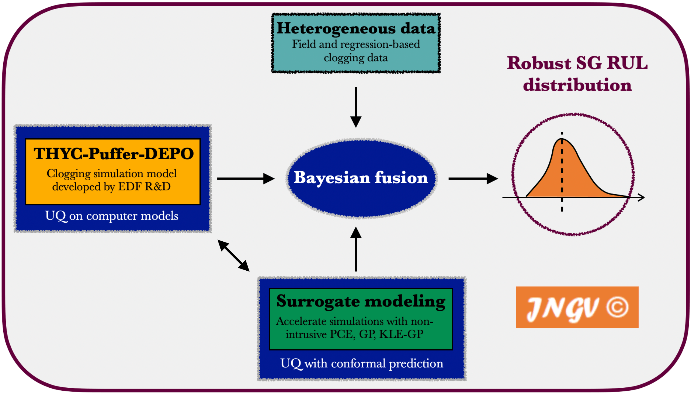 In our latest preprint, we introduce the final hybrid framework developed to address clogging in nuclear steam generators. This methodology integrates several components, culminating in a Bayesian fusion mechanism that delivers robust probabilistic estimates of the remaining useful life (RUL) for a given asset.